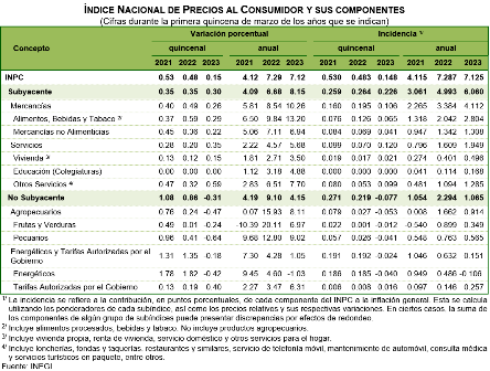 En la primera quincena de marzo de 2023, la variación anual del INPC fue de 7.12 % y la de los índices subyacente y no subyacente de 8.15 y 4.15 %, respectivamente. En el mismo periodo del año anterior, el INPC aumentó 7.29 % y sus componentes, 6.68 y 9.10 %, en ese orden.