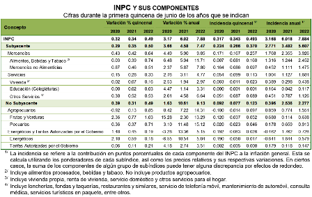 En la primera quincena de junio de 2022, el Índice Nacional de Precios al Consumidor (INPC) creció 0.49 % respecto a la quincena anterior. Con este resultado, la inflación general anual se ubicó en 7.88 por ciento. En la misma quincena de 2021, la inflación quincenal fue de 0.34 % y la anual, de 6.02 por ciento.