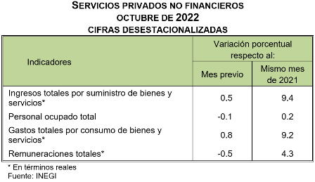 En octubre de 2022, con cifras ajustadas por estacionalidad y a tasa anual, el índice agregado de los ingresos totales reales por suministro de bienes y servicios aumentó 9.4 %; el de los gastos totales por consumo de bienes y servicios, 9.2 %; el índice de las remuneraciones totales, 4.3 % y el de personal ocupado total, 0.2 por ciento.