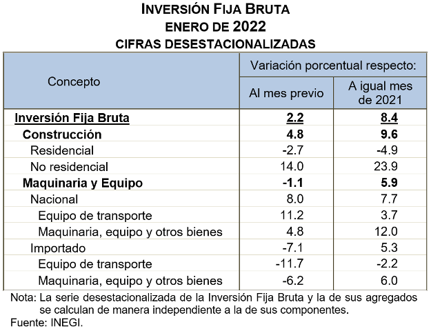 Durante el primer mes de 2022 y con series desestacionalizadas, la Inversión Fija Bruta se incrementó 8.4% a tasa anual en términos reales. A su interior, los gastos en Construcción se elevaron 9.6% y en Maquinaria y Equipo total ascendieron 5.9%.