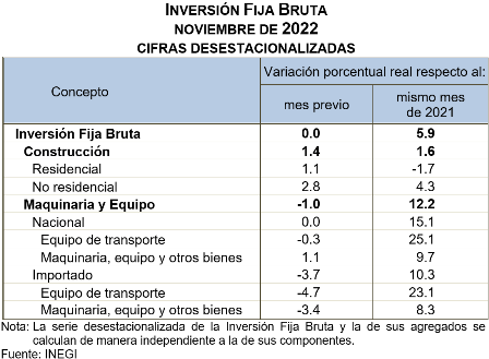 A tasa anual y con series desestacionalizadas, en noviembre de 2022, la Inversión Fija Bruta incrementó 5.9 % en términos reales. A su interior, los gastos en Maquinaria y Equipo total crecieron 12.2 % y en Construcción, 1.6 por ciento.