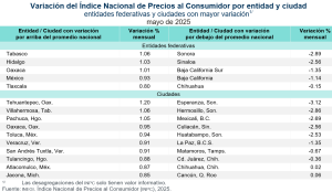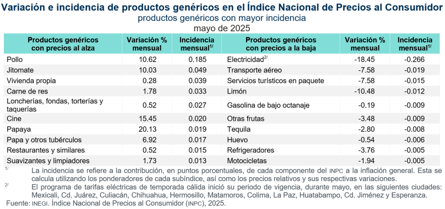 En mayo de 2025, los productos genéricos cuyas variaciones de precios, al alza y a la baja, destacaron por su incidencia sobre la inflación general fueron los siguientes: pollo, jitomate, vivienda propia, así como carne de res, con incrementos en sus precios. En contraste, la electricidad, el transporte aéreo, los servicios turísticos en paquete y el limón disminuyeron sus precios.