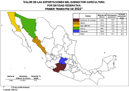 En el primer trimestre de 2022, las cinco principales entidades federativas que concentraron 73.7 % del valor de las exportaciones del subsector de Agricultura fueron: Michoacán de Ocampo, Sinaloa, Baja California, Sonora y Guanajuato.