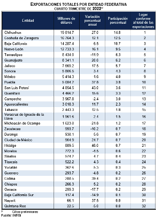 inegi exportaciones  3103En el cuarto trimestre de 2022, los estados con mayor contribución al valor total de las exportaciones fueron: Chihuahua (14.8 %), Coahuila de Zaragoza (12.5 %), Baja California (10.7 %), Nuevo León (9.5 %) y Tamaulipas (6.3 %). En conjunto, estas entidades sumaron 53.8 por ciento.