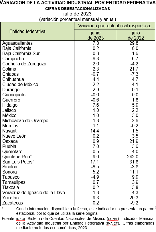 En julio de 2023 y con cifras ajustadas por estacionalidad, las entidades que registraron los crecimientos mensuales más pronunciados en su actividad industrial, en términos reales, fueron: San Luis Potosí, Nayarit, Yucatán y Quintana Roo.