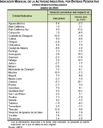 En enero de 2023 y con cifras ajustadas estacionalmente, las entidades que mostraron los crecimientos mensuales más pronunciados en su actividad industrial, en términos reales, fueron: Morelos, Tlaxcala, Baja California Sur, Colima y Nayarit.