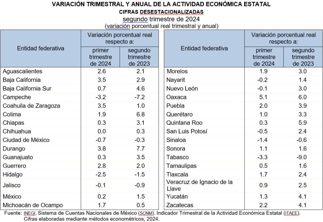 En el segundo trimestre de 2024, con cifras desestacionalizadas, las entidades federativas que registraron los mayores crecimientos en su actividad económica, respecto al trimestre anterior, fueron: Oaxaca, Durango, Coahuila, Baja California, Guerrero y Aguascalientes.