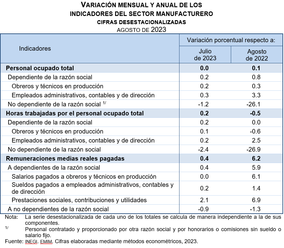 En el octavo mes de 2023 y a tasa mensual, el personal ocupado total en la industria manufacturera presentó el mismo nivel de julio pasado. Por tipo de contratación, el personal dependiente de la razón social aumentó 0.2 % —el número de las y los obreros y técnicos en producción incrementó 0.2 % y el de las y los empleados administrativos, contables y de dirección, 0.3 %—. El personal no dependiente cayó 1.2 por ciento.