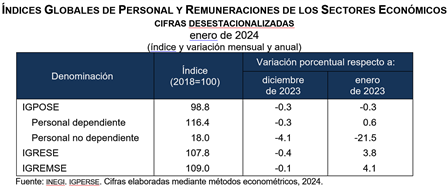 A tasa anual y con series desestacionalizadas, en enero de 2024, el IGPOSE bajó 0.3 %; el IGRESE creció 3.8 % y el IGREMSE, 4.1 por ciento.