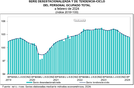 En febrero de 2024 y con datos ajustados por estacionalidad, el personal ocupado total del sector manufacturero disminuyó 0.2 % a tasa mensual. Las horas trabajadas ascendieron 0.4 % y las remuneraciones medias reales pagadas (sueldos, salarios y prestaciones sociales), uno por ciento.
