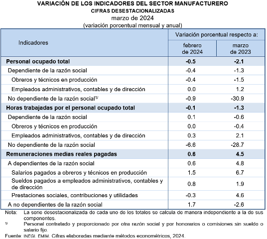 En marzo de 2024 y con datos ajustados por estacionalidad, el personal ocupado total del sector manufacturero disminuyó 0.5 % y las horas trabajadas cayeron 0.1 % a tasa mensual. Las remuneraciones medias reales pagadas (sueldos, salarios y prestaciones sociales) aumentaron 0.6 por ciento.