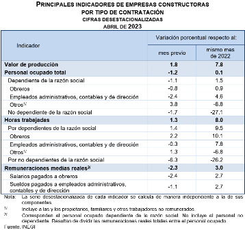 A tasa anual y con cifras desestacionalizadas, el valor real de la producción de las empresas constructoras creció 7.8 %; el personal ocupado total, 0.1 %; las horas trabajadas, 8 % y las remuneraciones medias reales, tres por ciento.