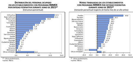 El personal ocupado en los establecimientos con programa IMMEX se incrementó 0.4% en junio de este año respecto al mes inmediato anterior, con cifras desestacionalizadas. Según el tipo de establecimiento en el que labora, en los manufactureros aumentó 0.5%, mientras que en los no manufactureros (que llevan a cabo actividades relativas a la agricultura, pesca, comercio y a los servicios) disminuyó 1.2% a tasa mensual.