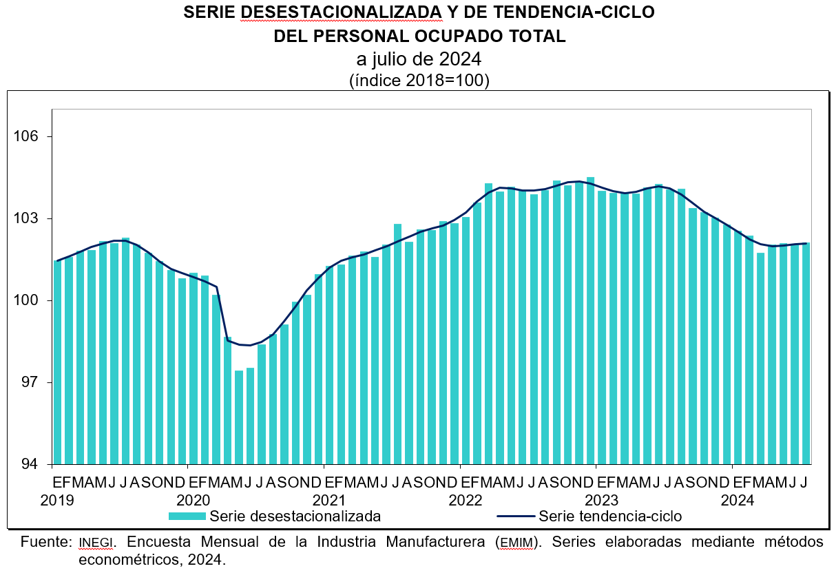 En julio de 2024 y con datos ajustados por estacionalidad, en el sector manufacturero, el personal ocupado total incrementó 0.1 % a tasa mensual. Las horas trabajadas permanecieron sin cambio y las remuneraciones medias reales pagadas (sueldos, salarios y prestaciones sociales) disminuyeron 0.7 % respecto a junio pasado.