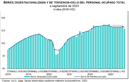 En septiembre de 2023 y con datos ajustados por estacionalidad, el personal ocupado total del sector manufacturero disminuyó 0.7 %, las horas trabajadas aumentaron 0.4 % y las remuneraciones medias reales pagadas (sueldos, salarios y prestaciones sociales), 0.7 % a tasa mensual.