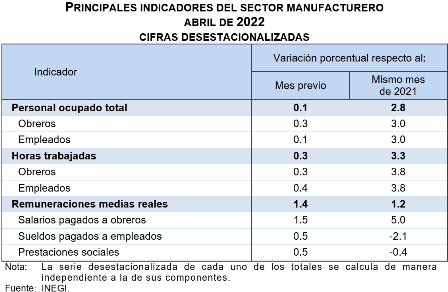 En abril de 2022, a tasa anual y con cifras ajustadas por estacionalidad, el personal ocupado total creció 2.8 %, las horas trabajadas, 3.3 %, y las remuneraciones medias reales subieron 1.2 por ciento.