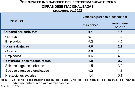 En diciembre de 2022, las horas trabajadas en las industrias manufactureras incrementaron 0.6 % respecto a las de noviembre pasado. Las horas correspondientes a las y los empleados, así como a las y los obreros, subieron 0.6 por ciento.