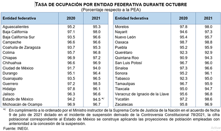 Con base en la Encuesta Nacional de Ocupación y Empleo, Nueva Edición (ENOEN) que levanta el INEGI en todo el país, a continuación se muestran los resultados más relevantes sobre la ocupación y el empleo para octubre de 2021.