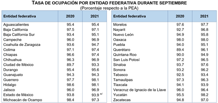 La población ocupada alcanzó 55.1 millones de personas (95.8% de la PEA) durante septiembre de 2021, cifra que significó un aumento de 4.2 millones de personas, ya que en igual mes del año pasado se estableció en 50.9 millones de personas. Por sexo, la ocupación de hombres fue de 33.7 millones, cifra superior en 2.3 millones respecto a la del noveno mes de 2020 y la ocupación de mujeres fue de 21.5 millones, 1.9 millones más, en igual lapso de comparación.