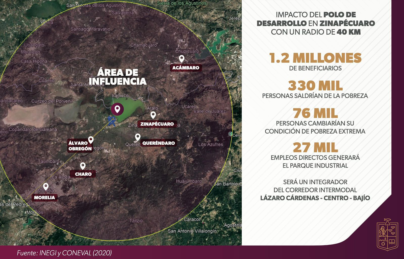 La instalación del Polo de Desarrollo para el Bienestar en Zinapécuaro generará 27 mil empleos formales directos, detonando la economía local y regional, además se prevé que 330 mil personas de la zona logren salir de la pobreza extrema, informó Claudio Méndez Fernández, titular de la Secretaría de Desarrollo Económico (Sedeco).