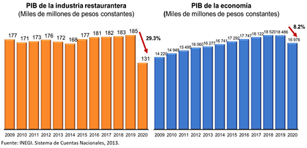 Debido a las restricciones y cierres de establecimientos al inicio de la crisis sanitaria causada por la COVID-19, se observó una caída profunda del Producto Interno Bruto (PIB) de la industria restaurantera de 29.3% en 2020 respecto a 2019, en tanto que el de la economía nacional se redujo 8.2 por ciento.