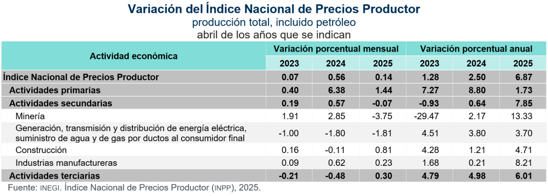 A tasa anual, en abril de 2025, los precios de las actividades primarias crecieron 1.73 %; los de las secundarias, 7.85 % y los de las terciarias, 6.01 %.