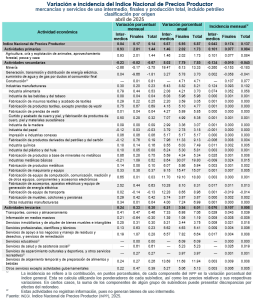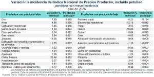 En abril de 2025, el INPP total, incluido petróleo, incrementó 0.14 % a tasa mensual y 6.87 % a tasa anual. En el mismo mes de 2024, creció 0.56 % a tasa mensual y 2.50 % a tasa anual.
