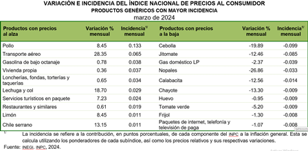 En marzo de 2024, el INPC registró un incremento de 0.29 % respecto al mes anterior. Con este resultado, la inflación general anual se ubicó en 4.42 por ciento. En el mismo mes de 2023, la inflación mensual fue de 0.27 % y la anual, de 6.85 por ciento.