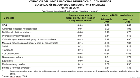 En la primera y segunda quincena de marzo de 2024, el INPC registró niveles de 134.085 y 134.046, respectivamente. Esto implicó un descenso quincenal de 0.03 por ciento.