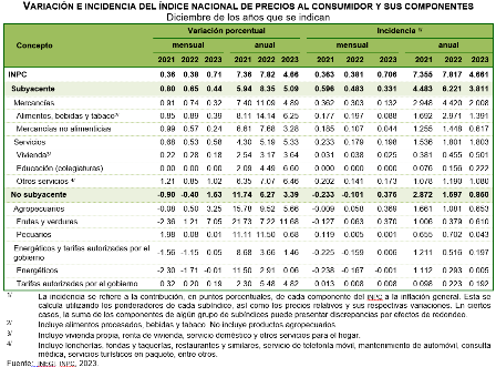En diciembre de 2023, la variación anual del INPC fue de 4.66 % y la de los índices subyacente y no subyacente fue de 5.09 y 3.39 %, respectivamente. En el mismo mes del año anterior, el INPC incrementó 7.82 % y sus índices componentes, 8.35 y 6.27 %, en ese orden.