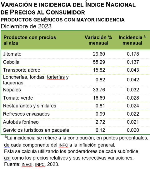 En diciembre de 2023, el INPC registró un incremento de 0.71 % respecto al mes anterior. Con este resultado, la inflación general anual se ubicó en 4.66 por ciento. En el mismo mes de 2022, la inflación mensual fue de 0.38 % y la anual, de 7.82 por ciento.