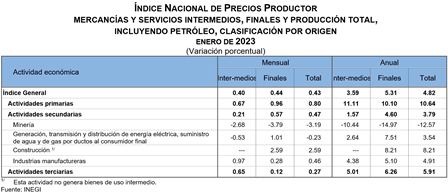 En enero de 2023, el Índice Nacional de Precios Productor (INPP) total, incluyendo petróleo, aumentó 0.43 % a tasa mensual y 4.82 % a tasa anual. En el mismo mes de 2022, creció 0.65 % a tasa mensual y 9.82 % a tasa anual.