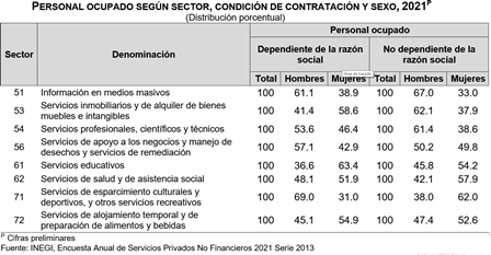 En Servicios de esparcimiento culturales y deportivos, y otros servicios recreativos, así como en Información en medios masivos, el personal ocupado dependiente de la razón social se conformó mayoritariamente por hombres: 61.1 y 69.0 %, respectivamente. Las mujeres tuvieron mayor participación en Servicios educativos, con 63.4 % y en Servicios inmobiliarios y alquiler de bienes muebles e intangibles, con 58.6 por ciento.