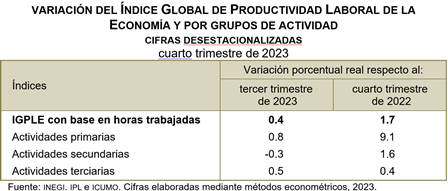 En el trimestre octubre-diciembre de 2023 y con cifras ajustadas por estacionalidad, el IGPLE -con base en horas trabajadas- aumentó 0.4 % a tasa trimestral.