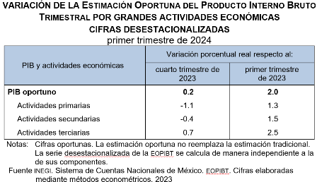 En el trimestre de referencia, a tasa anual y con series ajustadas estacionalmente, la estimación oportuna del PIB indica un crecimiento de 2 % en términos reales. Por actividad económica, la variación fue la siguiente: las actividades terciarias incrementaron 2.5 %; las secundarias, 1.5 %, y las primarias, 1.3 por ciento.