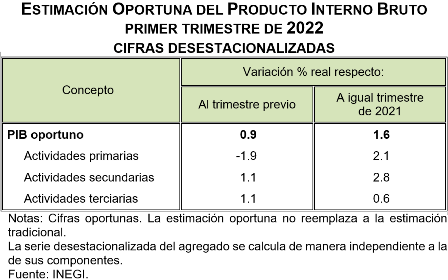 En el trimestre enero-marzo de 2022, a tasa anual y con series ajustadas estacionalmente la Estimación Oportuna del Producto Interno Bruto mostró un crecimiento real de 1.6%. Por actividad económica, los incrementos fueron de 2.1% en las actividades primarias, 2.8% en las secundarias y 0.6% en las actividades terciarias.