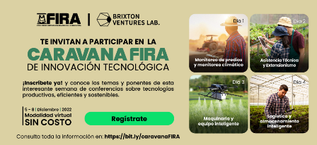 La Caravana FIRA de Innovación Tecnológica, una jornada de conferencias virtuales realizadas durante 4 días, busca difundir entre los pequeños agricultores el uso de nuevas tecnologías productivas y promover su vinculación con el mercado de servicios tecnológicos. Esta iniciativa de FIRA fue desarrollada en coordinación con Brixton Venture Labs, primer laboratorio de innovación en México dedicado a crear soluciones de emprendimiento e innovación en organizaciones de América Latina.