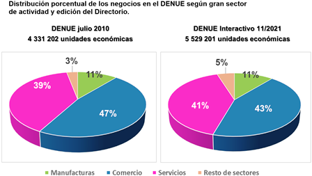 En julio de 2010, la primera versión del DENUE ofreció información de 4 331 202 negocios que se encontraron activos durante 2009. El DENUE Interactivo 11/2021 proporciona los datos de 5 529 201 negocios, de los que predominan los del sector terciario que realizan actividades de comercio y servicios. El estado de México y la Ciudad de México encabezan la lista en la distribución de los establecimientos.