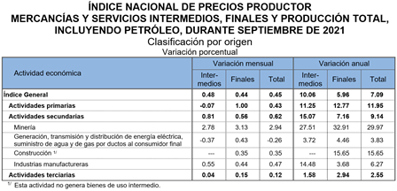 El Instituto Nacional de Estadística y Geografía (INEGI) informa que en el noveno mes de 2021 el Índice Nacional de Precios Productor (INPP) Total, incluyendo petróleo, registró un incremento de 0.45% mensual y de 7.09% anual. En igual mes de 2020 disminuyó 0.44% mensual y aumentó 3.80% a tasa anual.