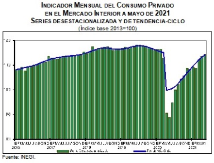 Por componentes, el consumo en Bienes de origen importado se incrementó 6.9%, mientras que el de Bienes y Servicios de origen nacional se mantuvo sin cambio en el quinto mes de 2021 respecto al mes previo, según datos ajustados por estacionalidad.