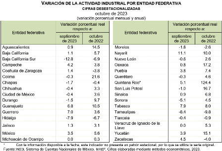 En octubre de 2023 y con cifras ajustadas por estacionalidad, las entidades federativas que registraron los crecimientos mensuales más pronunciados en su actividad industrial, en términos reales, fueron: Nayarit, Tabasco, Guerrero, Guanajuato y Quintana Roo.