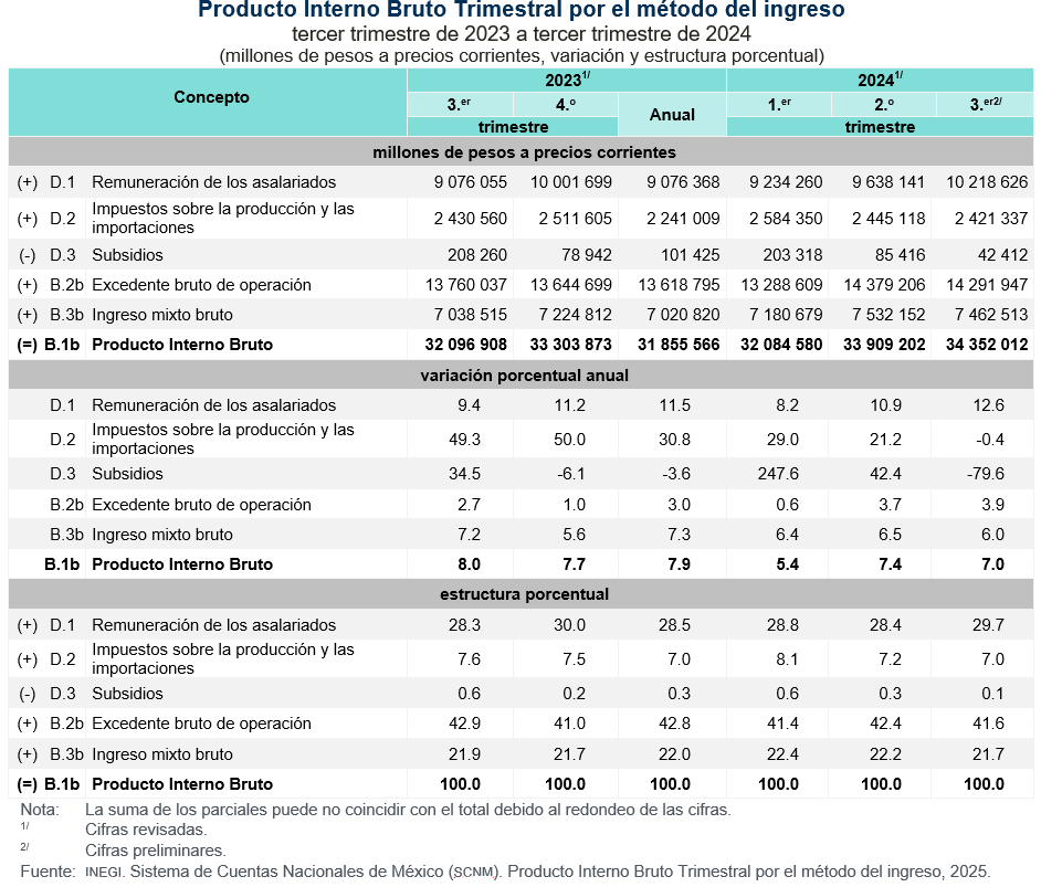 En el tercer trimestre de 2024, el Producto Interno Bruto (PIB) fue de 34.4 billones de pesos corrientes -los resultados se presentan a valores anualizados, por lo que son comparables con los que se presentan en el PIB oportuno y el PIB trimestral-, y se distribuyó como pago a los factores de producción en: Remuneración de los asalariados, con un monto de 10.2 billones de pesos; Impuestos sobre la producción y las importaciones, 2.4 billones de pesos; Subsidios -al tratarse de pagos obligatorios sin contrapartida, tiene un valor contable negativo y se descuenta de la renta nacional-, 42 412 millones de pesos; Excedente bruto de operación, 14.3 billones de pesos, e Ingreso mixto bruto, 7.5 billones de pesos corrientes.