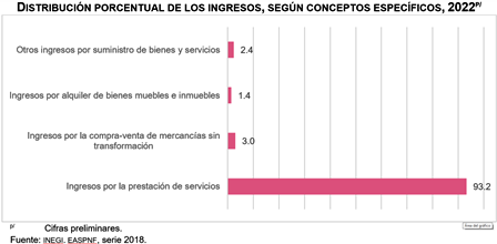 En 2022, los ingresos por la prestación de servicios denotaron una mayor participación, con 93.2 % del total en los establecimientos; seguidos por los ingresos por la compraventa de mercancías sin transformación con 3.0 % durante 2022.