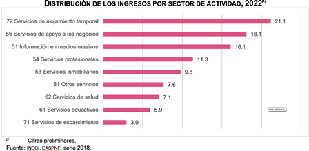 De los sectores que más aportaron al valor total de los ingresos por suministro de bienes y servicios destacaron: Servicios de alojamiento temporal, con 21.1 % y Servicios de apoyo a los negocios, con 18.1 por ciento