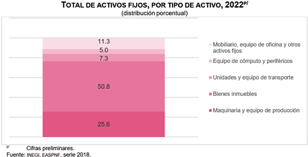 En el análisis de los datos estadísticos sobre la variable de los activos fijos, se observa que los establecimientos de servicios invirtieron en mayor proporción en bienes muebles, en este caso 50.8 % del total de los activos fijos en 2022. El tipo de activo fijo con menor inversión fueron equipos de cómputo y periféricos con 5.0 %.