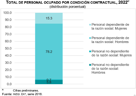 En el agregado de Transportes, el personal ocupado que depende de la razón social tuvo una participación de 78.2 % de hombres. La suma de hombres y mujeres, en el rubro de personal ocupado no dependiente de la razón social, participó con 6.5 %.