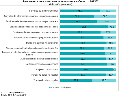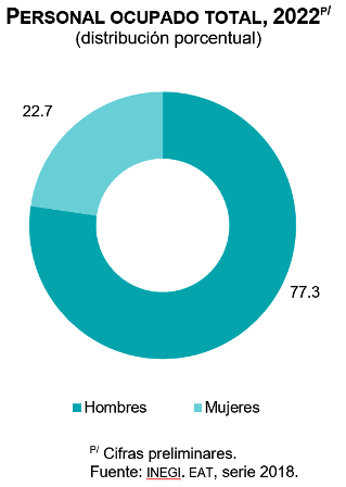 En 2022, el promedio de participación del personal ocupado de Transportes y los servicios relacionados fue de 77.0 % para hombres y 23.0 % para mujeres.