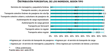 Los que más aportaron al valor total de los ingresos por suministro de bienes y servicios fueron Transporte de carga general, con 27.3 %; Transporte aéreo regular, con 22.6 % y Transporte de carga especializado, con 18.6 por ciento