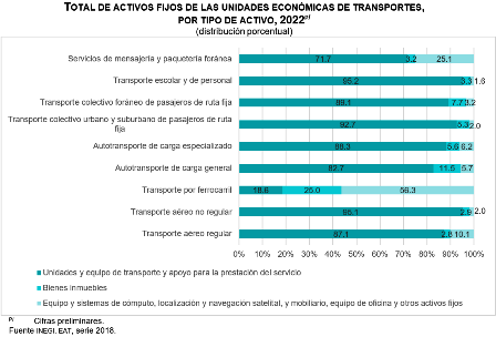 En el análisis de los datos estadísticos sobre la variable de los activos fijos, se observa que los establecimientos de Transportes invirtieron más en unidades y equipo de transportes. Las actividades con más inversión en este rubro fueron: Transporte aéreo regular y no regular (87.1 y 95.1 %, respectivamente), Transporte escolar y de personal (95.2 %), Transporte urbano y suburbano de pasajeros de ruta fija (92.7 %) y Transporte foráneo de pasajeros de ruta fija (89.1 %).