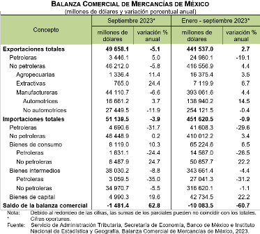 En septiembre de 2023, la información oportuna de comercio exterior indica un déficit comercial de mil 481 millones de dólares, saldo que se compara con el déficit de 910 millones de dólares obtenido en el mismo mes de 2022.
